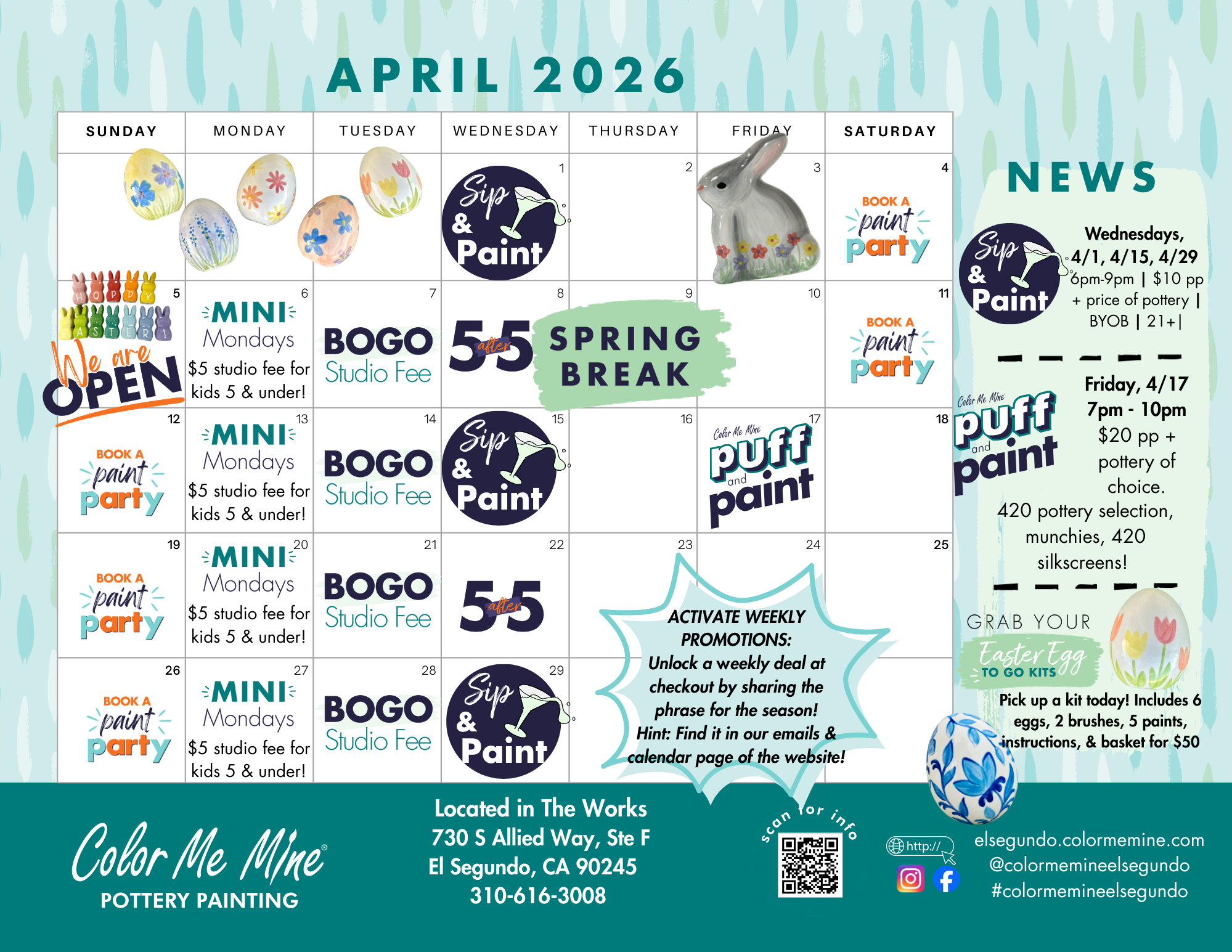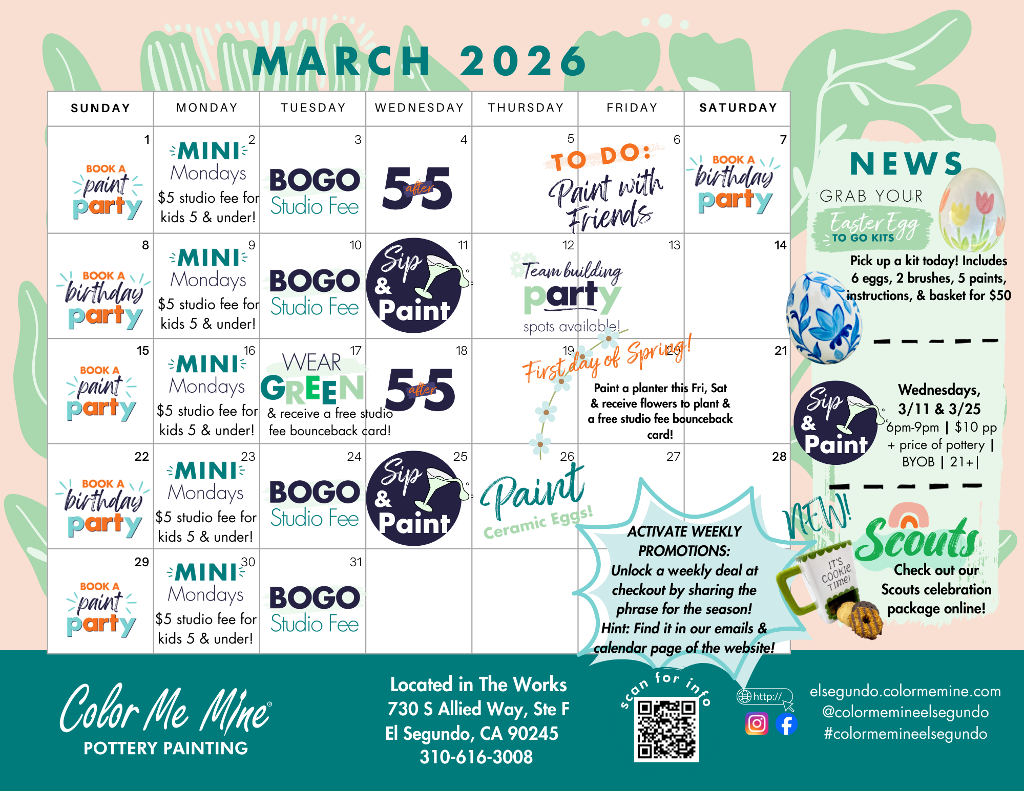 March & April happenings! Check out the FUN events in our studio today. Use this word at checkout to activiate the weekly promotions: