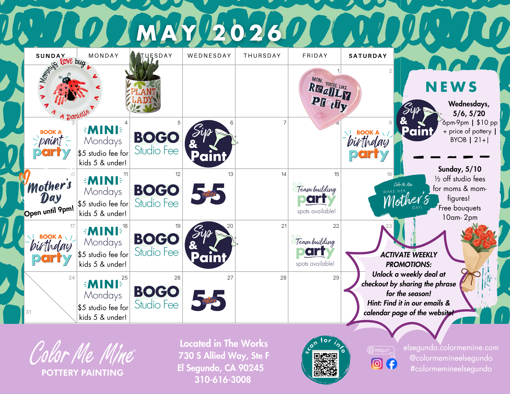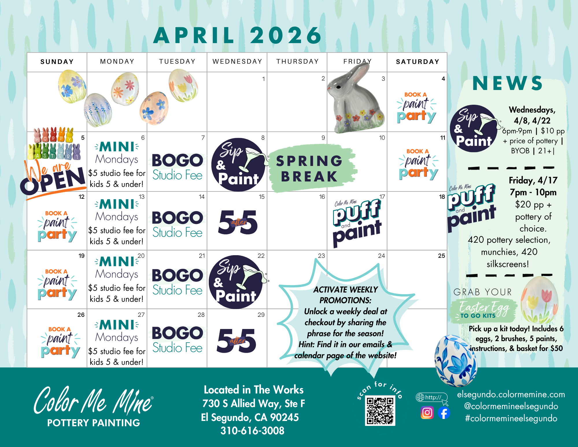 April & May happenings! Check out the FUN events in our studio today. Use this word at checkout to activiate the weekly promotions:
